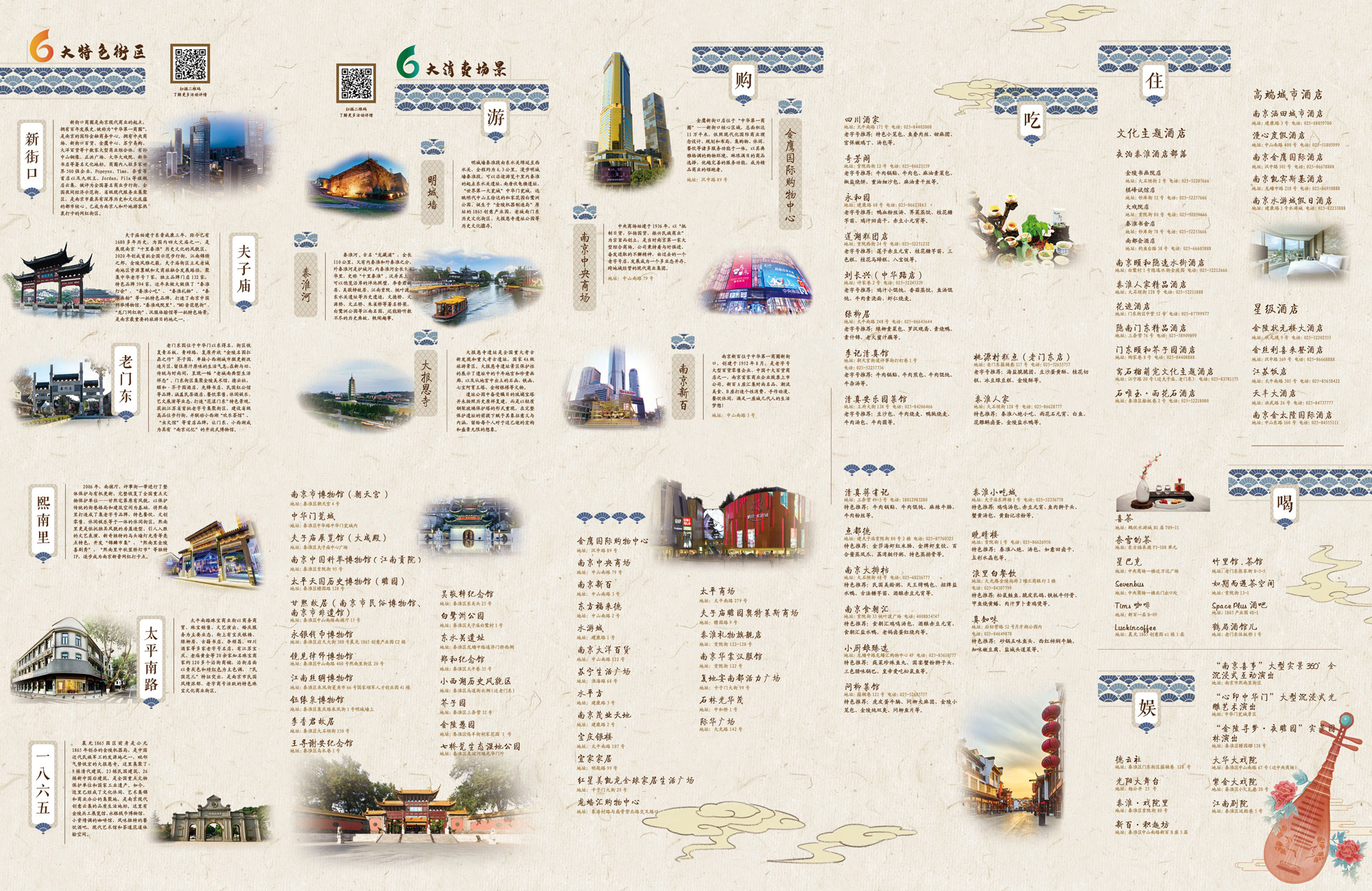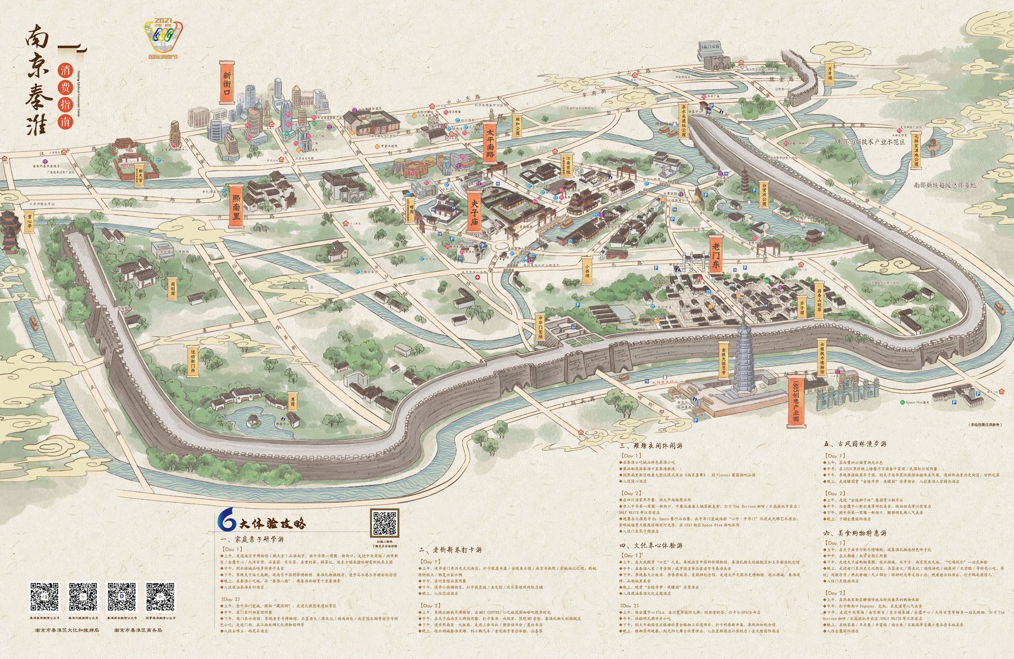 此次活动还印制了秦淮特色消费指南,搭建了活动统一发布平台——悦秦淮,制作了秦淮666国际消费节系列活动专属二维码。市民、游客可使用微信或支付宝扫码进入秦淮666国际消费节系列活动专题网页。网页下方有“六大特色街区”“六大消费场景”和“六大体验攻略”的入口。以“六大消费场景”板块为例,首批上架了六大消费场景百余个商家的商品与服务。用户点击进入后,在板块页面里可以看到“吃、喝、购、游、住、娱”不同场景的商户,各类品牌汇聚一堂,交相辉映。
