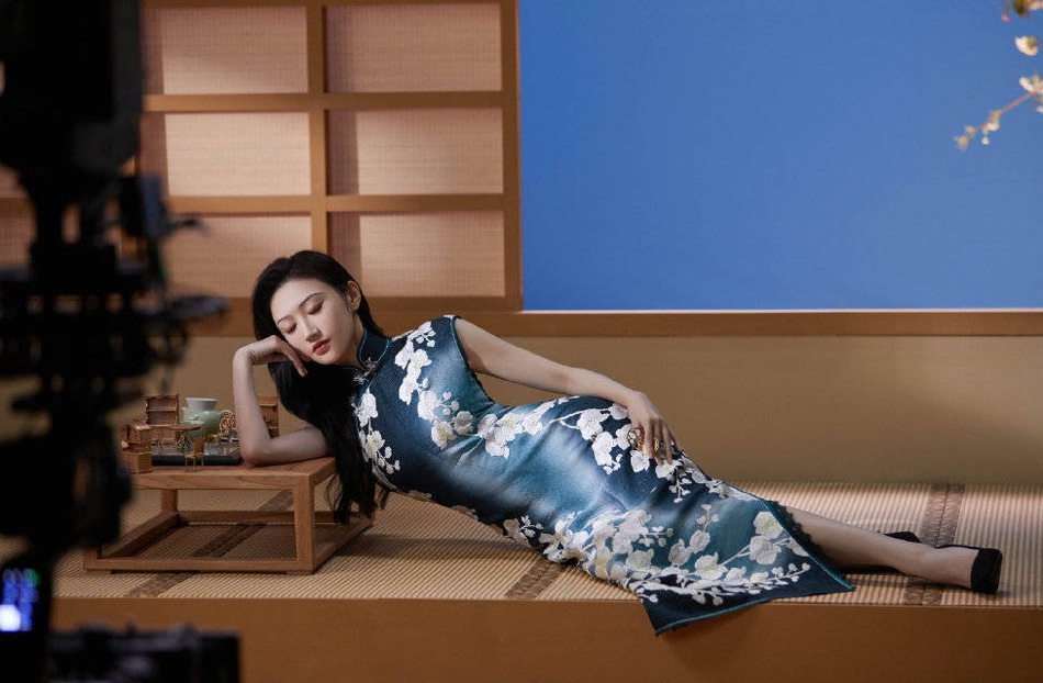 景甜再穿旗袍 倚桌而眠身段婀娜