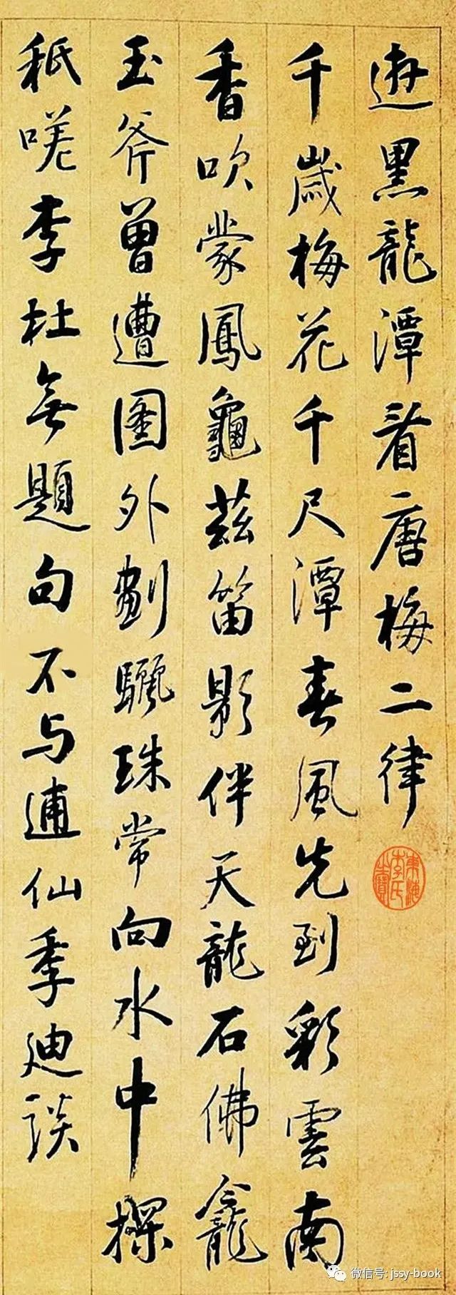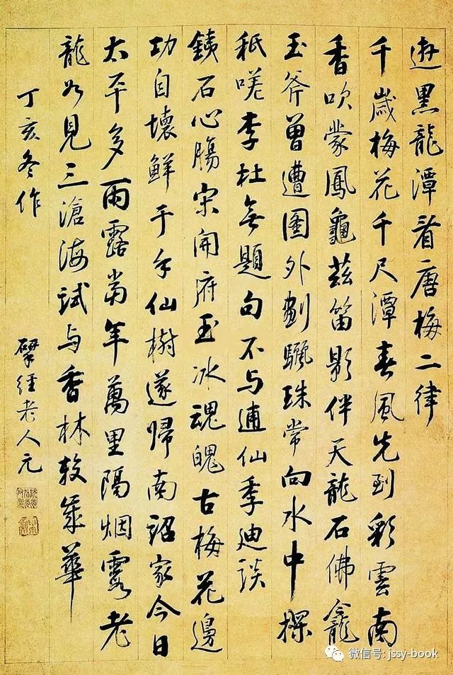 释文:游黑龙潭看唐梅二律:(一)千岁梅花千尺潭,春风先到彩云南,香吹蒙凤龟兹笛,影伴天龙石佛龛。玉斧曾遭图外划,骊珠常向水中探,秖嗟李杜无题句,不与逋仙季迪谈。(二)铁石心肠宋开府,玉冰魂魄古梅花,边功自坏鲜于平,仙树遂归南诏家,今日太平多雨露,当年万里隔烟霞,老龙如见三沧海,试与香林较岁华。丁亥(1827年)冬作。揅经老人元。