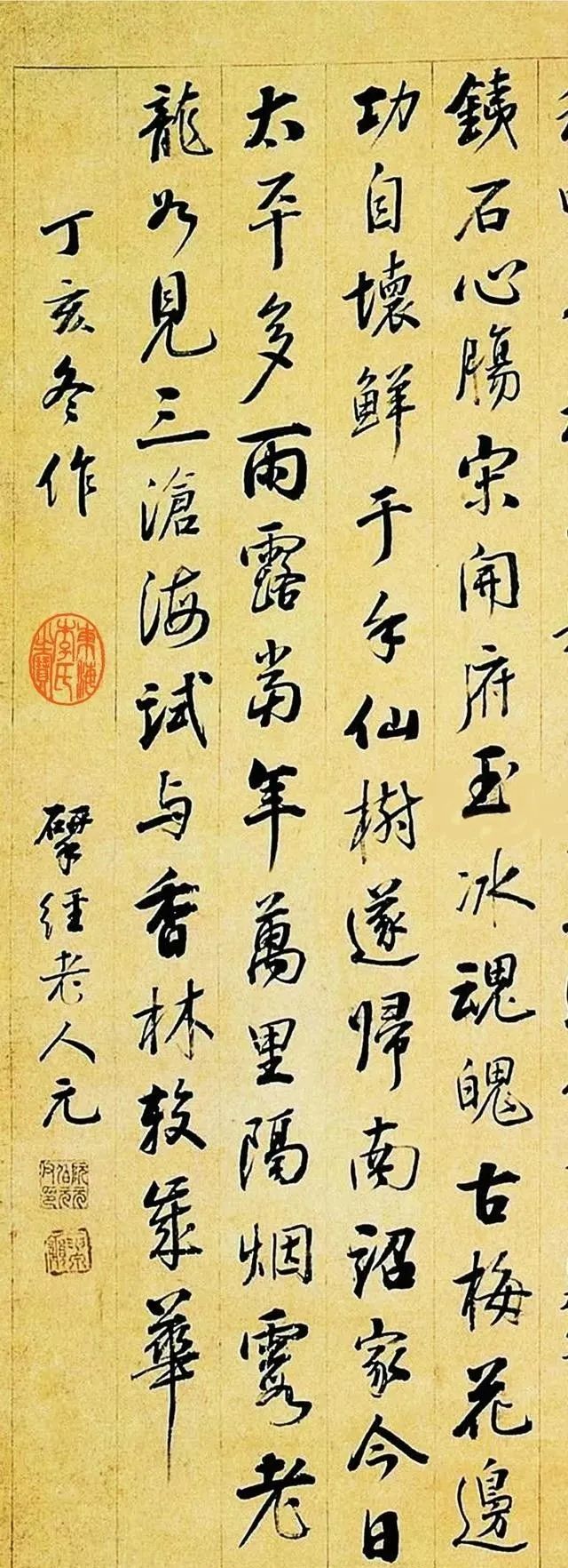 说明:查《阮元年谱》(黄山书社),第804页知阮元于丁亥游黑龙潭及潭上龙王庙,黑龙潭在昆明市北郊龙泉山五老峰下,阮元诗刻石原嵌于上观三清殿禾玉照堂壁上现存上观碑亭内。刻石高1.38米,宽0.63米,厚0.06米。上截题为《游黑龙潭看唐梅二律》,署“丁亥冬作揅经老人元”,书法行楷。此幅既为其原本。