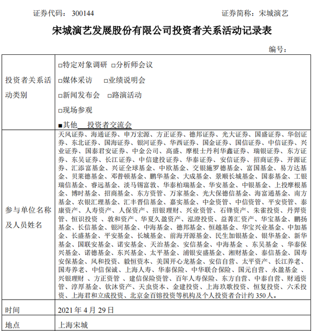 4月30日傍晚,宋城演艺公布了4月29日的投资者关系活动记录表,共计有机构及个人投资者有约350人参与,热度颇高。其中不乏各大知名机构的身影,包括汇添富、兴证全球、中欧、交银施罗德、富国、易方达等59家公募基金;中信证券、招商证券、海通证券等28家券商;以及泓澄、敦和、石锋、朱雀等百亿私募。