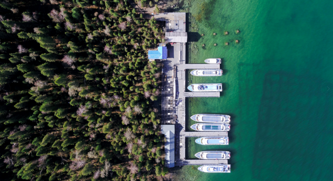 在喀纳斯换乘中心乘坐前往湖边停车场的的区间车,抵达后,顺着木栈道前往双湖码头,途间,会遇见映山湖的光影画卷,会经过森林的清新恬淡,映山湖应该是这段路上最特别之处了吧,远处的山在阳光的作用下倒映在平静的湖面,如果阳光和位置刚刚好,影子和山会完整地贴合在一起,山在远处,山也在脚下。抵达双湖码头后可在这里购买船票。