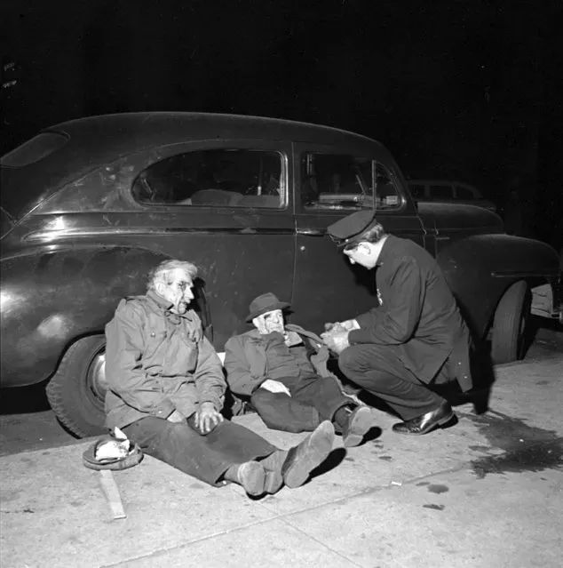 不过她的十几万张胶片里,显然有更多自拍之外的创作。1953年,27岁的薇薇安·迈尔就已经掌握了夜间摄影和闪光灯技巧,当年的圣诞节前夜,她抓拍到纽约东区人行道上的一场打架斗殴,两个中年男人血迹斑斑地躺在路边。这张照片像一个经典的黑色电影场景,又具备了优秀的新闻摄影水准,同时还充满了一种戏谑和幽默的味道。