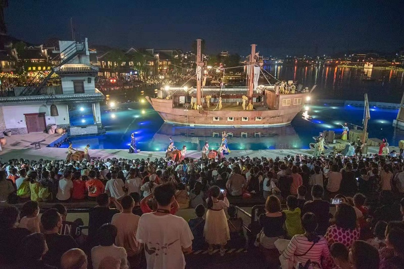 夜游逛累了,游客还可以跟随夜的风情看一场演艺传奇——《铜官故事》,感受唐朝盛世和丝绸之路上发生的绝美爱情故事。大型沉浸式演出《铜官故事》是为夏夜专门打造的实景演出。演出分为5个篇章,长达60分钟,119人共同演绎一场由千年爱情串联的海上丝绸之路。“国风大巡游”、民间绝活“赤足走大刀”、“大唐乐舞”“醉萌醒狮”等全天60余场的演出也精彩纷呈。