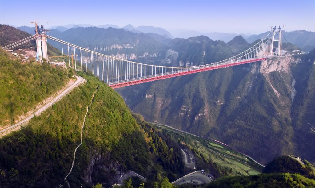 它修筑于矮寨镇上空 335 米处,全长 1176 米,连接吉首、茶洞两岸高山,横跨矮寨大峡谷,气若长虹。作为当时世界上跨度最大的山区桥梁,矮寨大桥创造了四项 " 世界首创 ":世界首创 " 塔 - 梁分离式悬索桥 " 新结构、世界首创 " 轨索滑移法 " 架设加劲梁新工艺、世界首创碳纤维材料岩锚体系、世界首创 " 轨索滑移法 " 运梁新装备。
