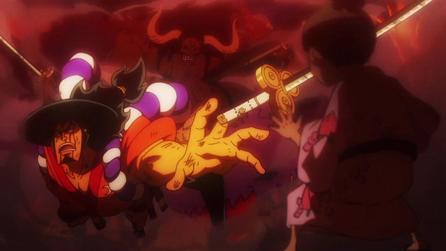 巨龙凯多从天被斩落,御田手持双刀,冲向落地的凯多。御田口中喊道“不许再来和之国了”,原以为胜负已定,但结果自然没能如愿。如果御田在这里打败了凯多,也就没有时空穿越和20年后的事情了。
