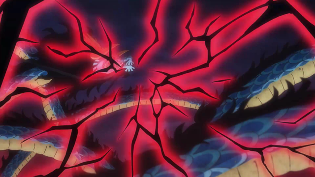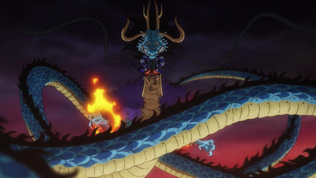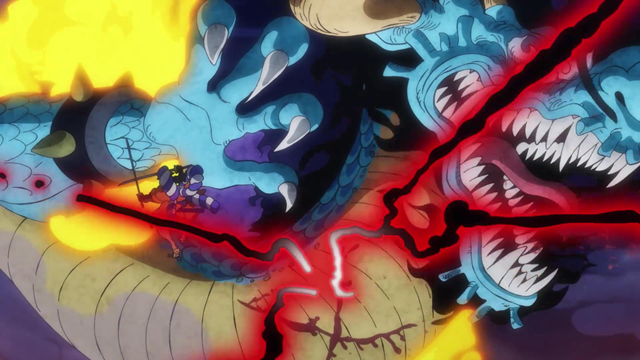 凯多以巨龙形态在空中,对于御田来说,其实是很不利的。距离太远,凯多就远程龙息,跳到空中,御田没有稳定的著脚点。一番激烈的战斗,御田回忆加身,一招“御田二刀流·桃源十拳”,在凯多身上留下伤口,凯多从天而落。