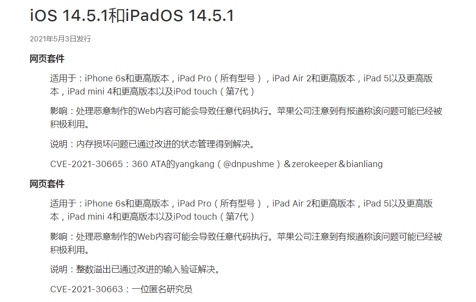 除了解决相关收不到App提示的App跟踪透明度相关问题外,还修复两个WebKit重大漏洞,可影响到导致任意代码执行,不过,该漏洞可能已经被其它黑客进行利用。