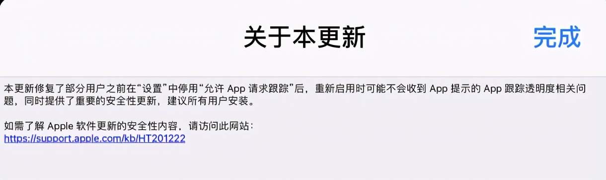 从更新包描述内容得知,告诉我们修复了之前在iOS 14.5系统中,部分用户停用“允许APP 请求跟踪”后,重启启用不会收到App提示的App跟踪透明度相关问题。