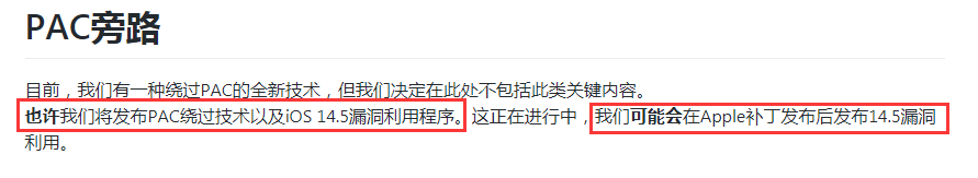 也提到过,他们有一种绕过PAC防护机制的全新技术,也许将会发布PAC绕过技术以及iOS 14.5漏洞利用程序,并且还告诉我们,可能会在Apple补丁发布后发布14.5漏洞利用。(有种不确定公开)