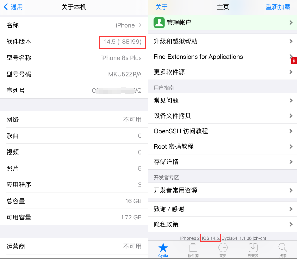关于 Checkra1n 越狱的问题,我拿 iPhone 6S Plus 设备进行测试,系统为 iOS 14.5.1,使用 checkra1n 0.12.3 工具成功越狱。