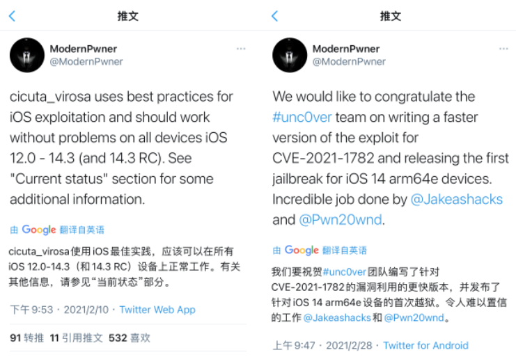到底是谁,那我们就不太清楚了,但最近我们留意 ModernPwner 作者,他就是之前公开 iOS 14.3 及以下系统漏洞。