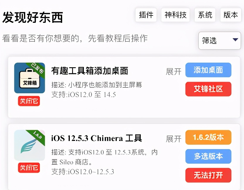 如果你想为 iOS 12.5.3 系统越狱的,可前往「有趣工具箱」小程序,找到 Chimera 工具安装,而目前掉签,建议在电脑爱思助手自签安装。
