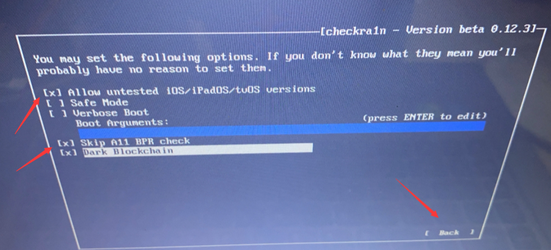 注意!因 checkra1n 目前支持 iOS 14.5,但你可以绕版本越狱,在 checkra1n 工具打开 Options 选项,勾选 Allow 开头,如果A11设备需要勾选 Skip A11 选项,返回即可引导越狱。