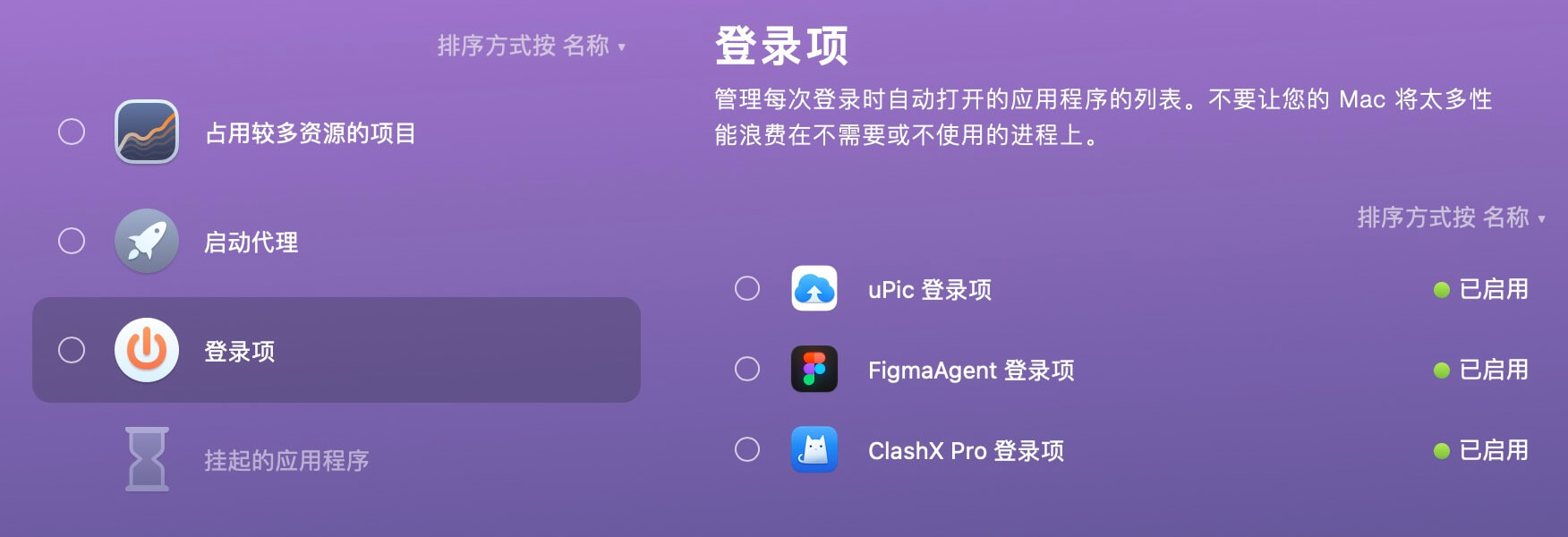 而 CleanMyMac X 中所定义的登录项,主要包含应用程序类,开机自动运行代替手动运行的结果,这些在系统偏好设置中都可以进行设置。