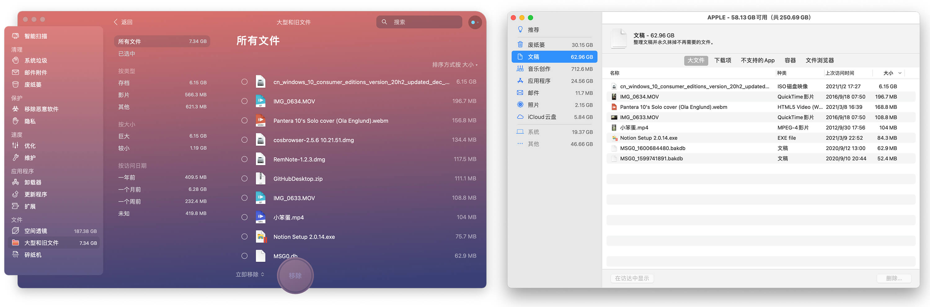 在大文件浏览管理上,CleanMyMac X 所展示信息更加全面,除了根据类型区分外,还可以单独查看一年前或者一个月前这些时间久远的文件。「所有文件」一类中可以查看快速查看硬盘上所有空间的大型文件,包括废纸篓中,这会比系统自带功能更加方便。
