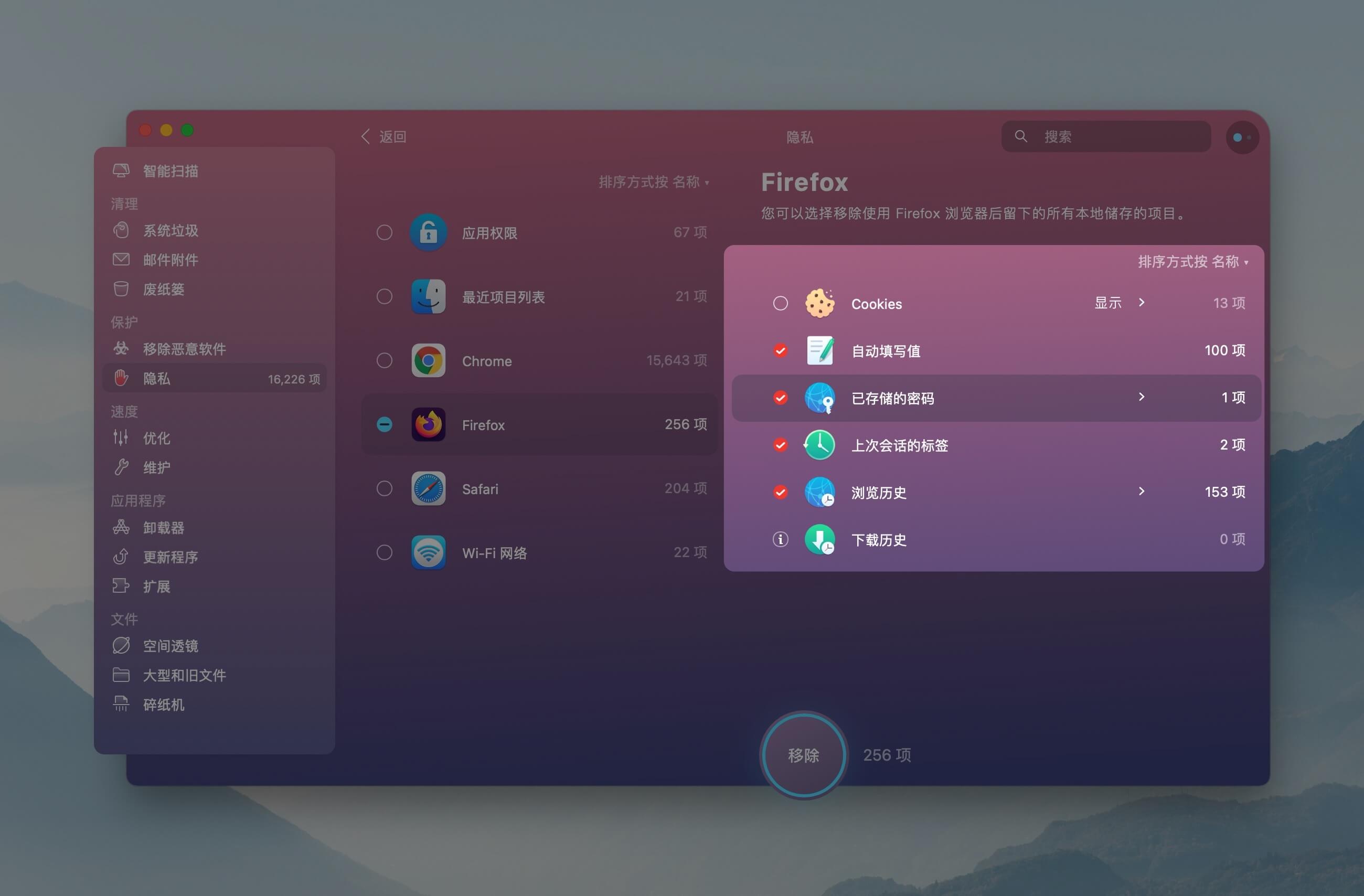 浏览器是大多数人日常使用最频繁的应用,CleanMyMac X 目前还不支持微软 Edge 浏览器的隐私清理,只支持 Chrome、FireFox 以及 Safari,根据需要清理浏览器的 Cookies、自动填写值、浏览历史等。