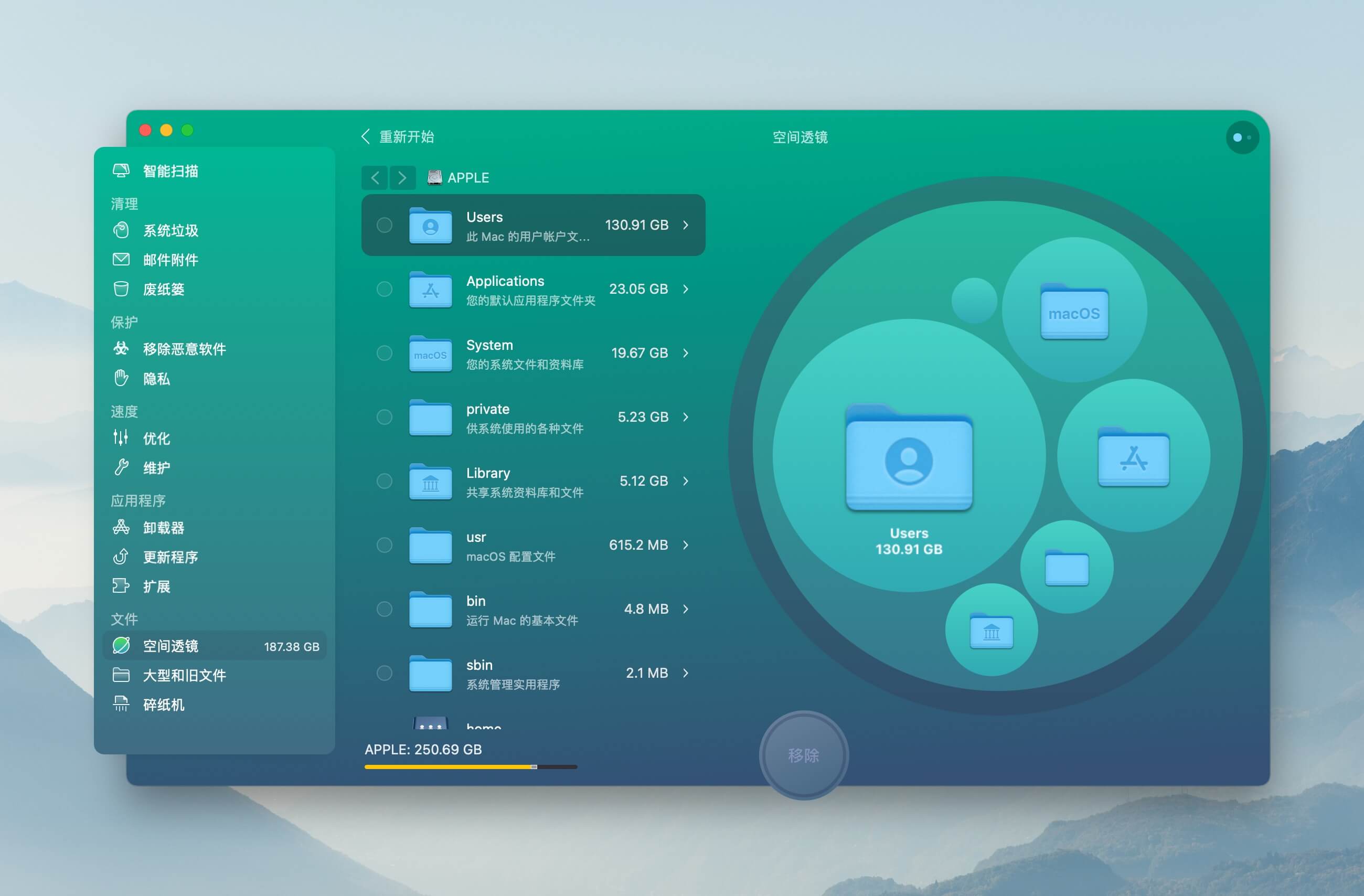 「空间透镜」会对全盘空间进行快速扫描,根据文件夹存储大小排列,并且生成右侧的圆形视图,占据空间越大的文件夹所在圆形也就越大,视觉效果拉满。