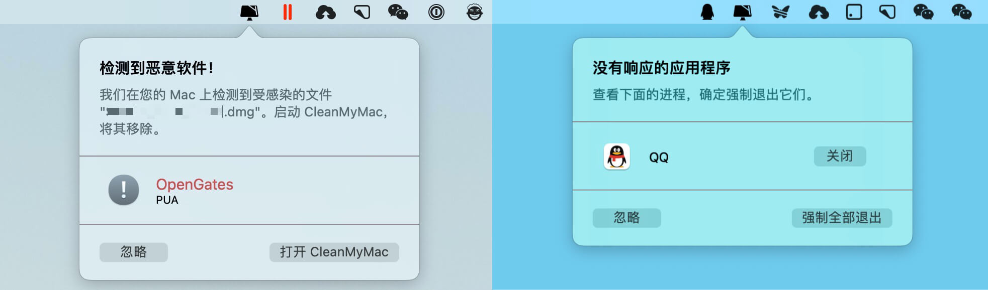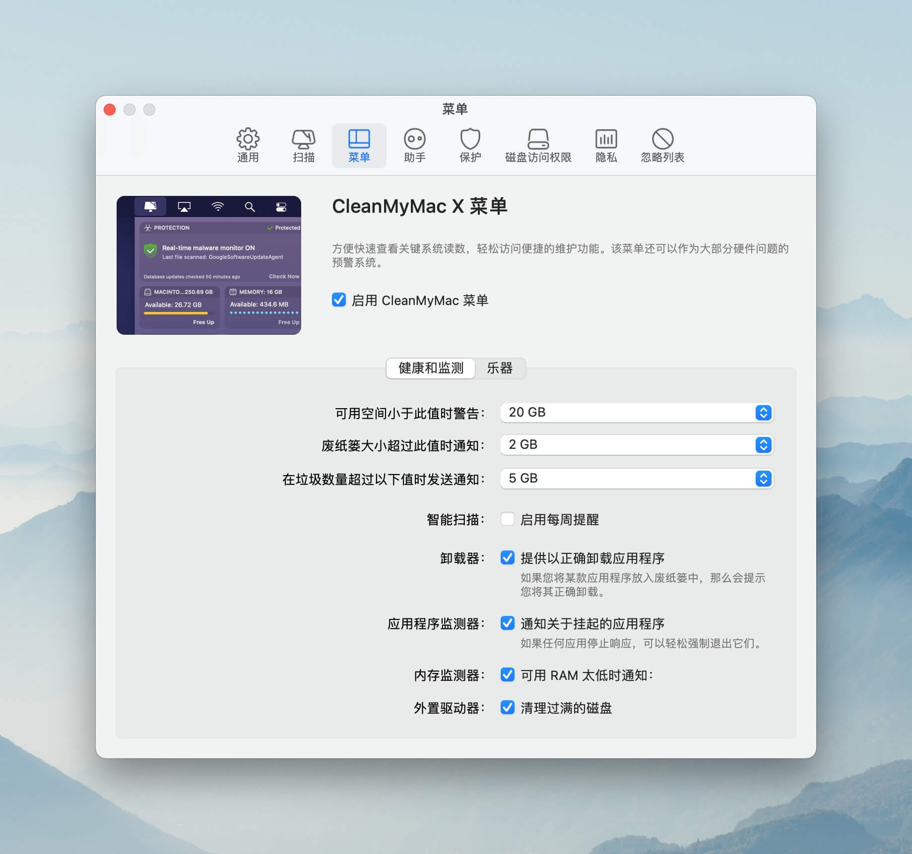 菜单栏助手开启后,也能起到对当前系统的后台监测作用。一旦发现异常情况,如检测到恶意软件、某个应用进程卡死或者废纸篓文件超出预设限制,都会进行弹窗提醒,引导用户进一步处理。