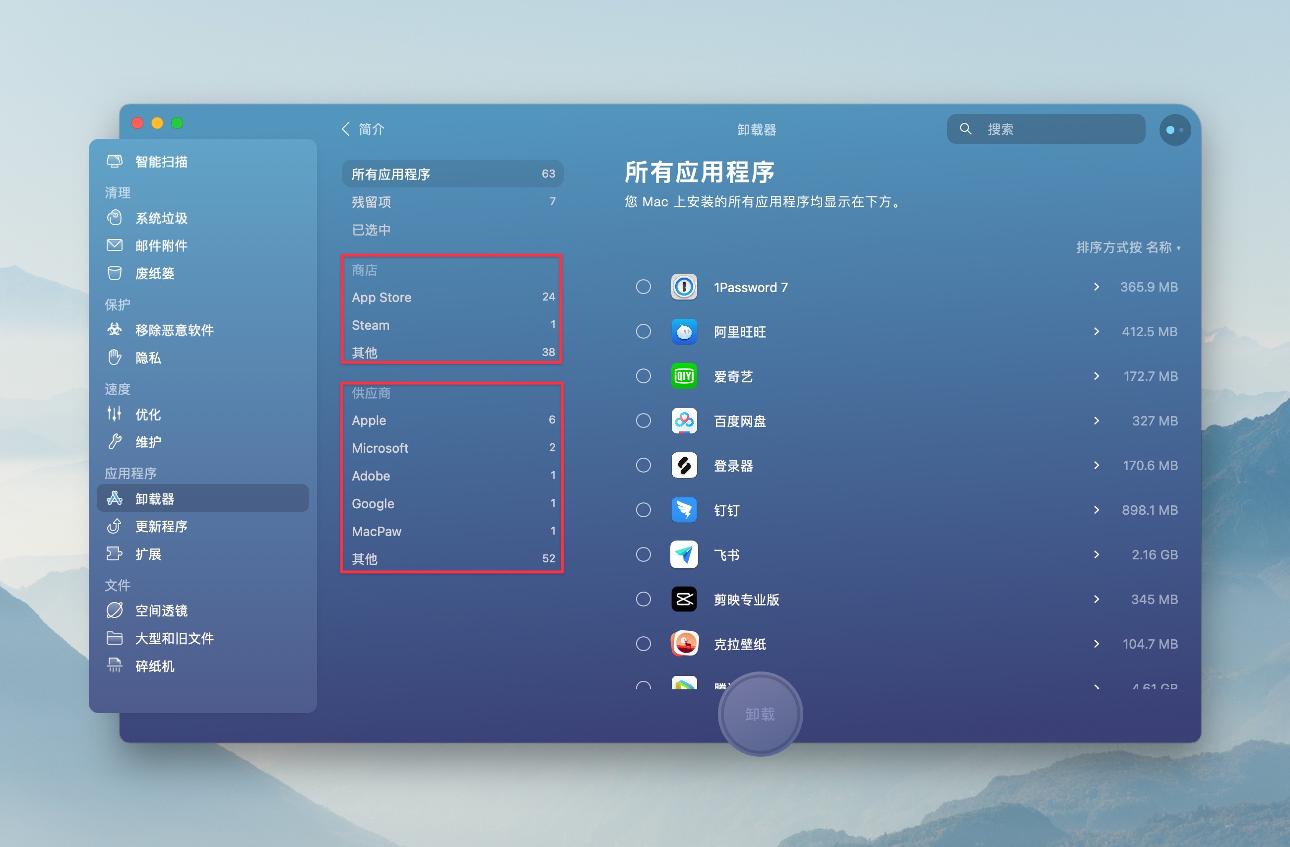 在 CleanMyMac X 卸载器中,预设了一些分组以便对应用进行区分管理,根据安装渠道,Mac App Store 安装的应用为一组,Steam、Setapp 应用也均会独立分组;此外也有根据供应商来区分,如 Apple、Adobe、Microsoft、Google 等也都被单独列出来。
