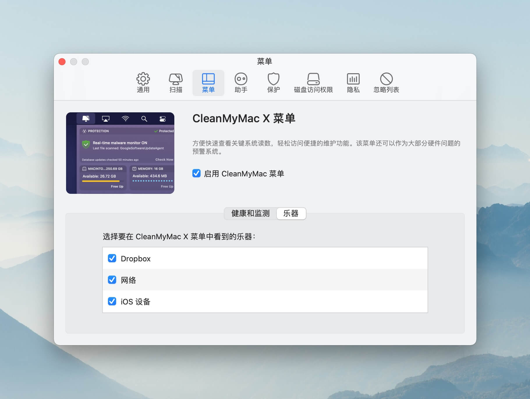 如果你觉得 CleanMyMac X 菜单栏预设功能太多或者提醒太频繁,可以在设置中进行调整,只勾选你希望被监测的系统动态或者需要显示的功能,不过只有网络、iOS 设备、Dropbox 网盘这三个可以自定义勾选。