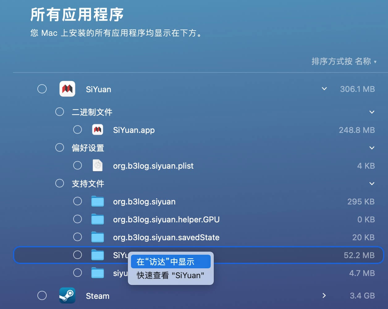 每一个应用程序所占空间大小一目了然,点击展开应用程序包,就能查看更细致的二进制文件、偏好设置、支持文件以及日志等所有相关数据的存储信息,并且能够快速在访达中打开,卸载时当然也都会一并清理掉。
