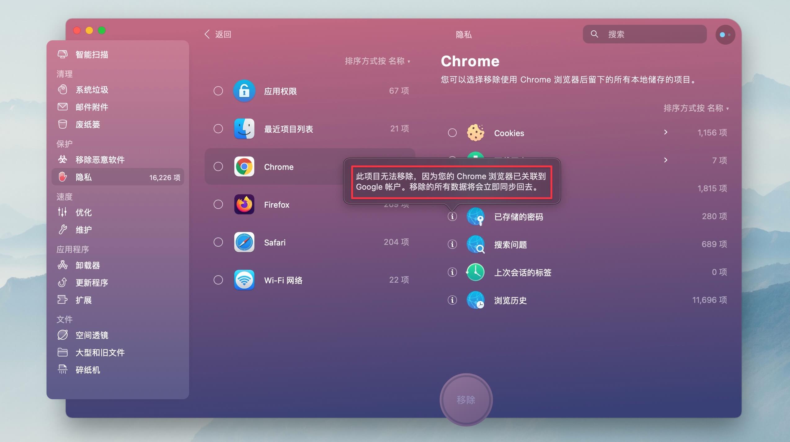 不过对于 Chrome 浏览器,如果使用了 Google 账号同步体系,可能没办法直接通过 CleanMyMac X 清除已存储密码、浏览历史等数据,因为 CleanMyMac X 只能清理清理本地数据,无法对 Google 账号云端数据进行清除,建议还是直接通过 Chrome 浏览器「隐私设置和安全性」功能进行清理。
