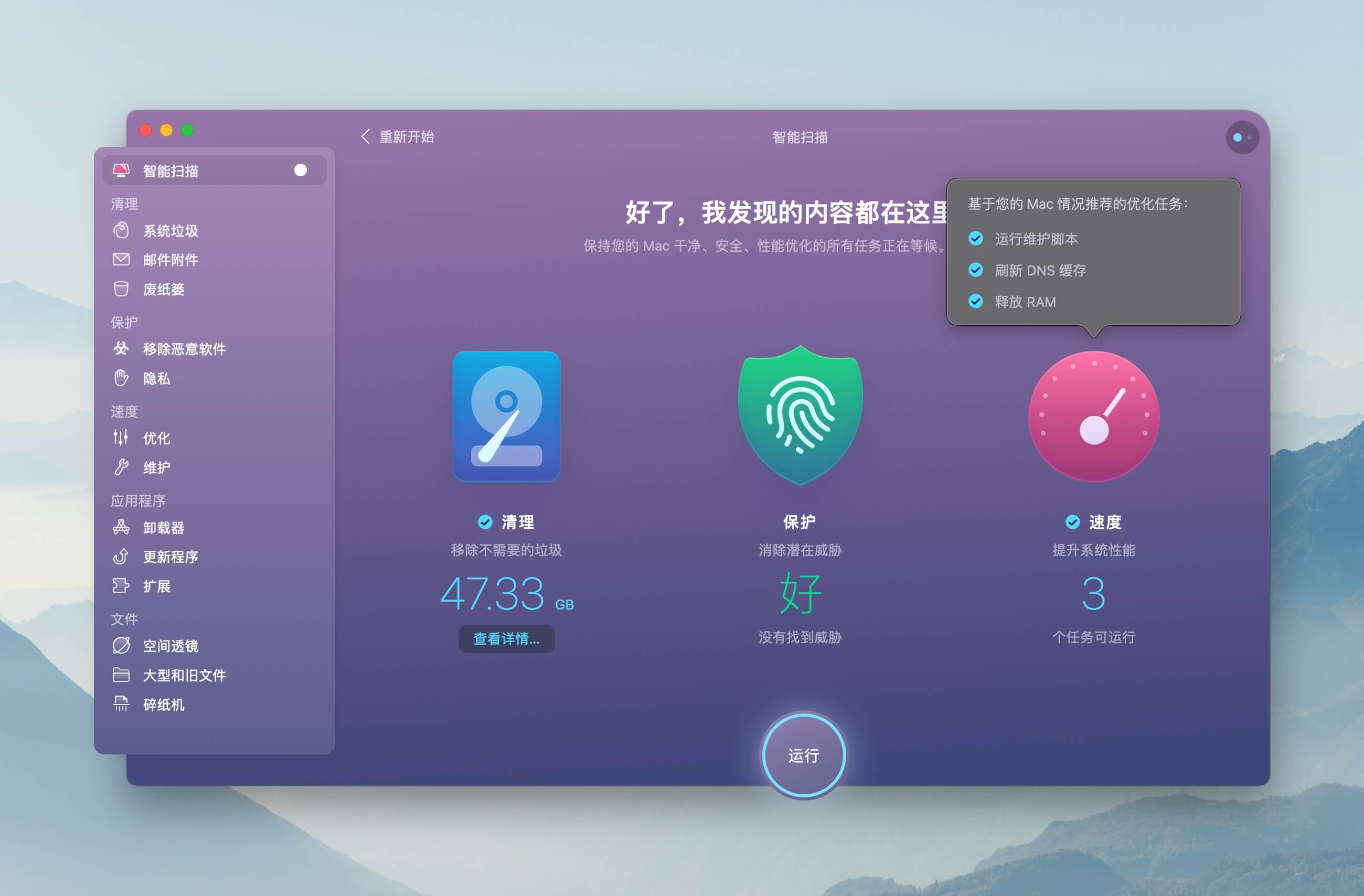 相比 Windows 系统上某些电脑管家、安全卫士之流,CleanMyMac X 已经相当克制了。没有无脑的新增各种功能,而是主要集中在系统清理、优化、安全、文件管理以及辅助性功能上,这些基本都是 macOS 用户需求量较大的,且具备一定实用性。