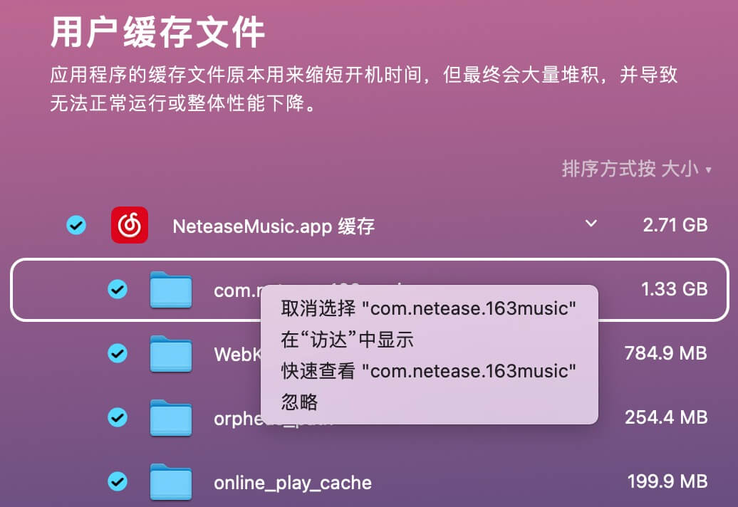 在需要为磁盘腾出一定空间的情况下,清理应用缓存可以有不错的效果。CleanMyMac X 直观地显示出各缓存文件夹的大小,并且可以「在访达中显示」该文件,方便进行定向清理。