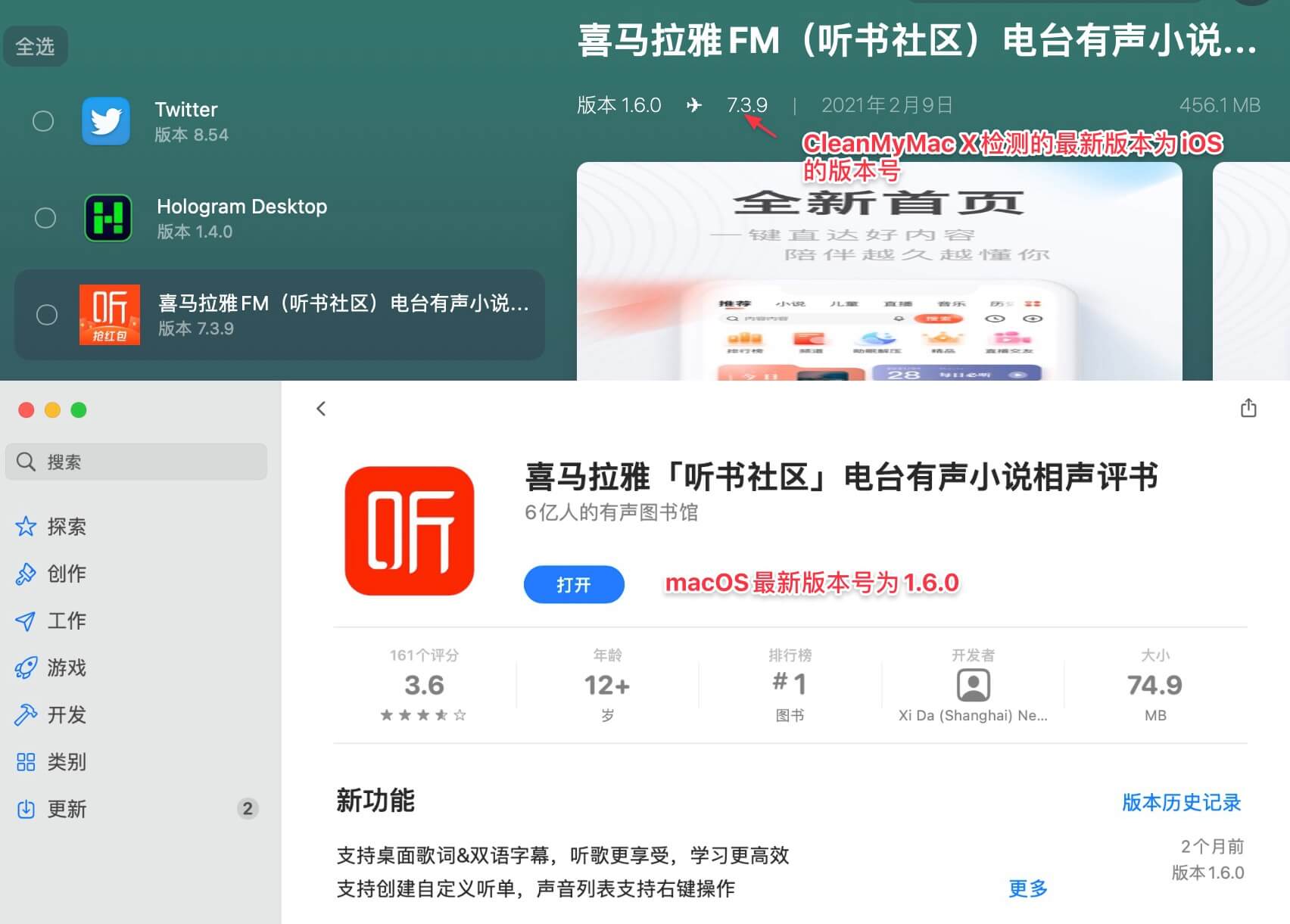 然而也存在一些特殊情况,例如上图中 App Store 提示的剪映专业版新版信息,却并没有被 CleanMyMac X 检测到。其次如喜马拉雅这类 Catalyst 应用,在 CleanMyMac X 上检测到的更新信息可能出错,其显示的为 iOS 版本更新信息,这显然在 macOS 上是无法直接使用的(M1 版 mac 未测试,情况未知)。