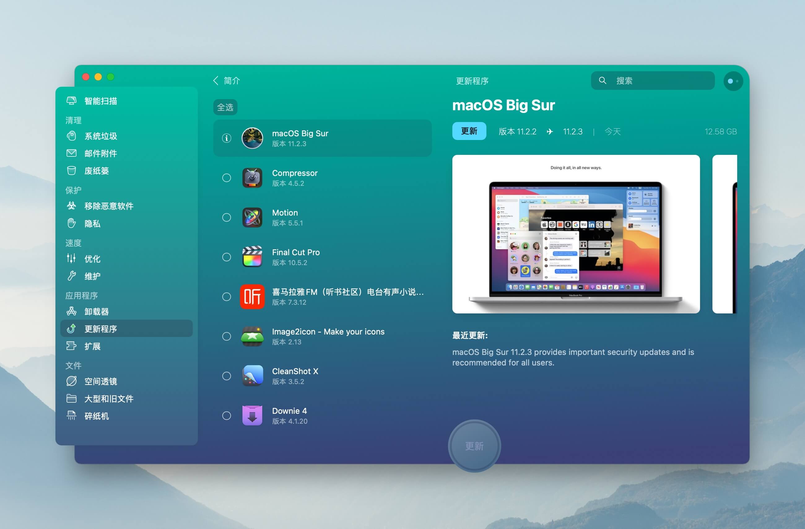 CleanMyMac X 既可以检测到通过 Mac App Store 安装的应用是否有新版本发布,也支持多数第三方渠道安装的应用更新状态,例如 Sketch、Downie、IINA 等等,并且都可以在 CleanMyMac X 中进行一键更新。