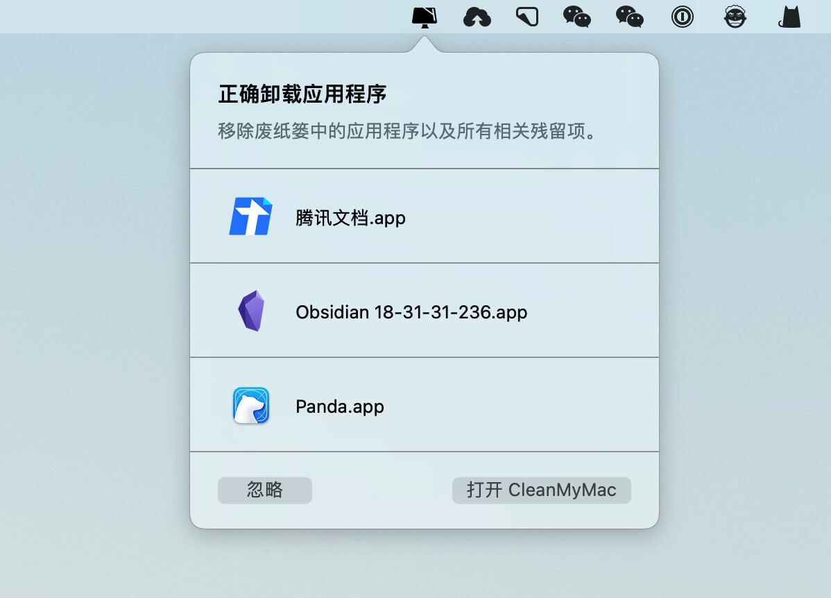 如果直接从「应用程序」文件夹中移除软件,CleanMyMac X 菜单栏则会弹窗提醒,指引打开 CleanMyMac X 扫描卸载残留文件,以便做进一步清理。