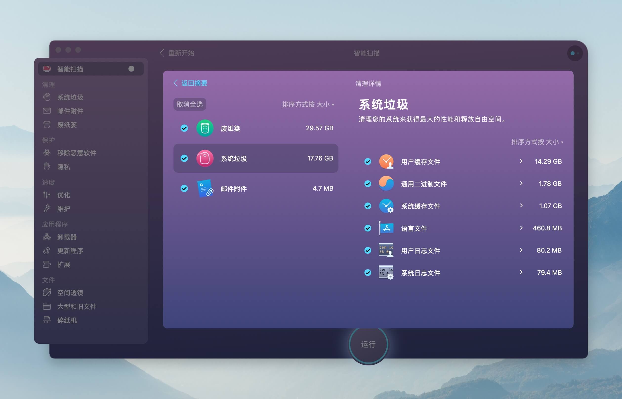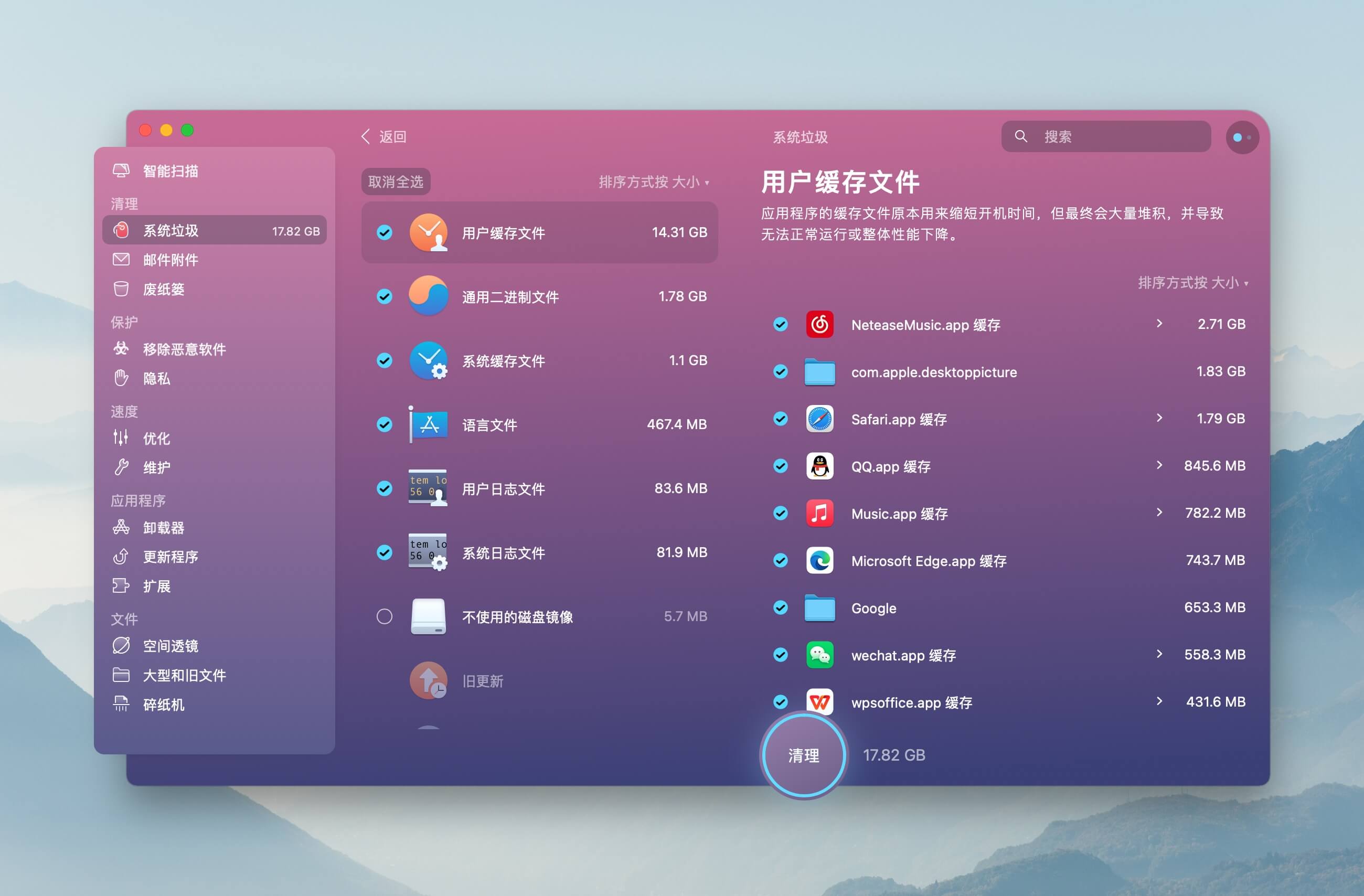 CleanMyMac X 系统垃圾清理功能可以一键扫描出磁盘上各种类型缓存、日志文件、不需要的语言文件等常见类型。一般情况下,占比较多的基本都是经常使用的应用程序所产生的缓存文件。