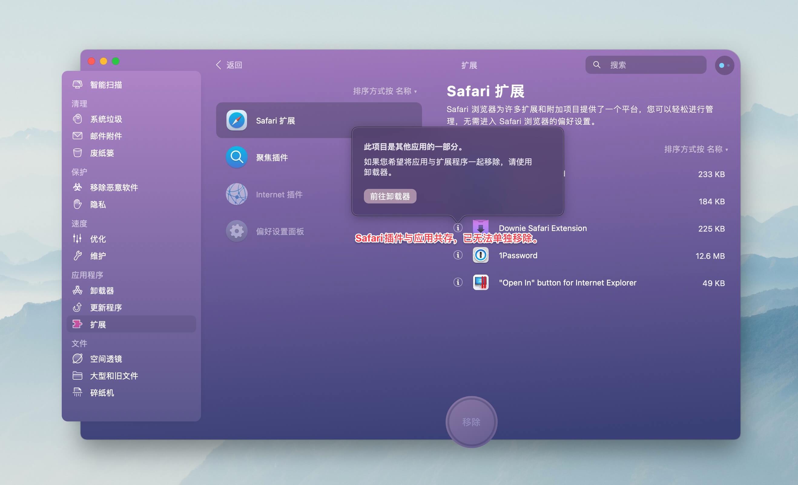 在 macOS 上,部分软件安装后往往会同时附带一些拓展,多为 Safari 浏览器的插件,如 1Password、Downie、RSS 订阅工具等,这些拓展基本与主应用程序共存,无法单独卸载,如果真的不想要,那就在 Safari 浏览器中不要启用就好。