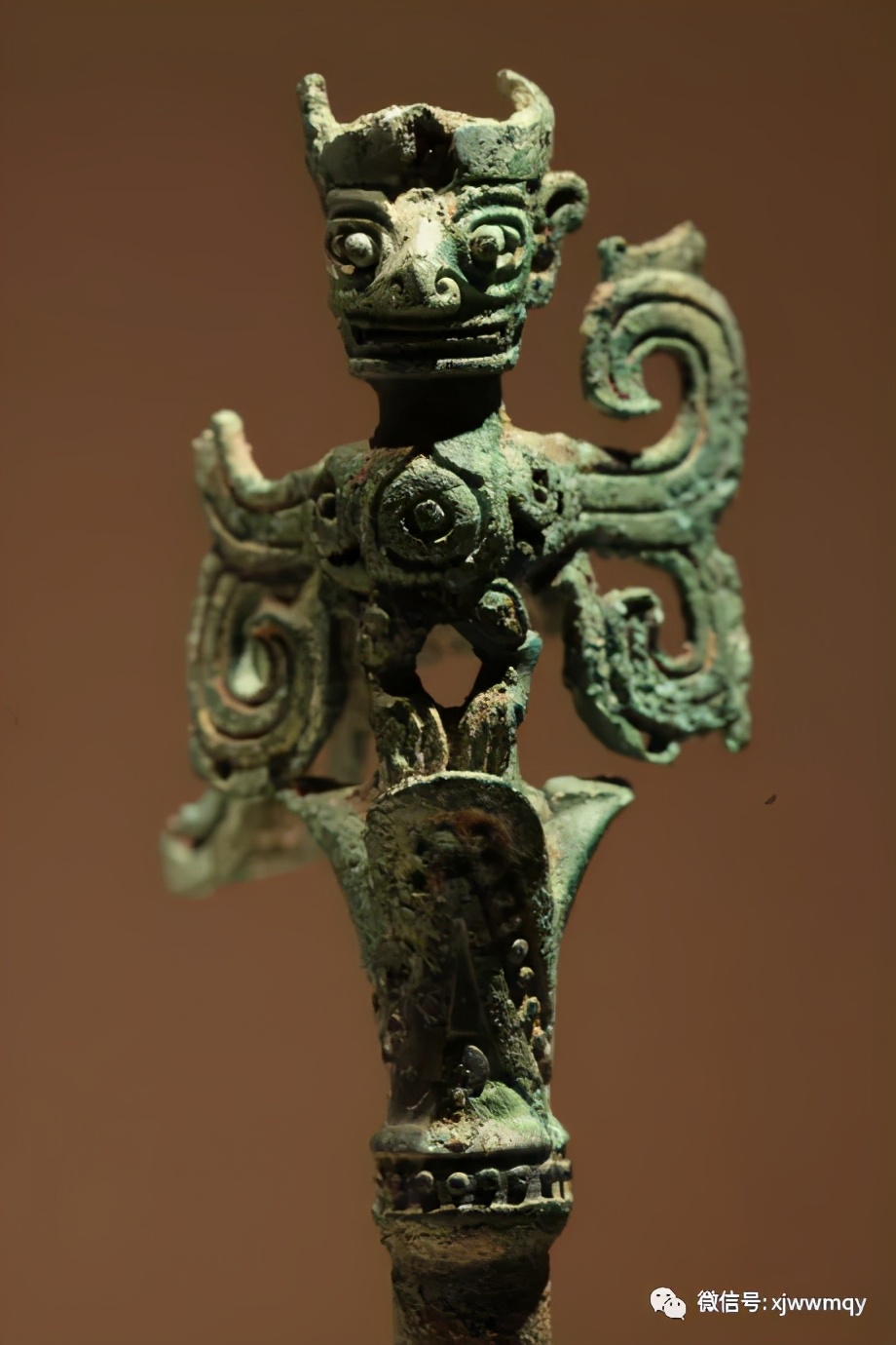 三星堆出土立于神树枝头上的有翅神人。它的头部造型与青铜大立人是一样的,但已变成猕猴才有的短而弯曲的腿,长着三趾鸟爪,“仙”是也。