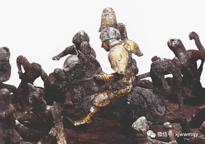 这个骑马“金人”头有高冠,全身披挂着盔甲,但脚却是赤裸着的,肩部呈鸟翅展开之状,这代表它不是普通人,而是神灵所属的“琼布”。