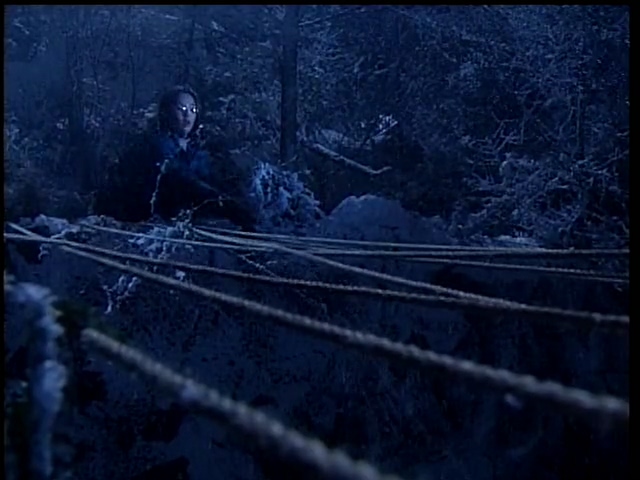 她预先在断崖的两边用数条绳索固定住,接着在绳索上面放置一堆稻草跟雪。
