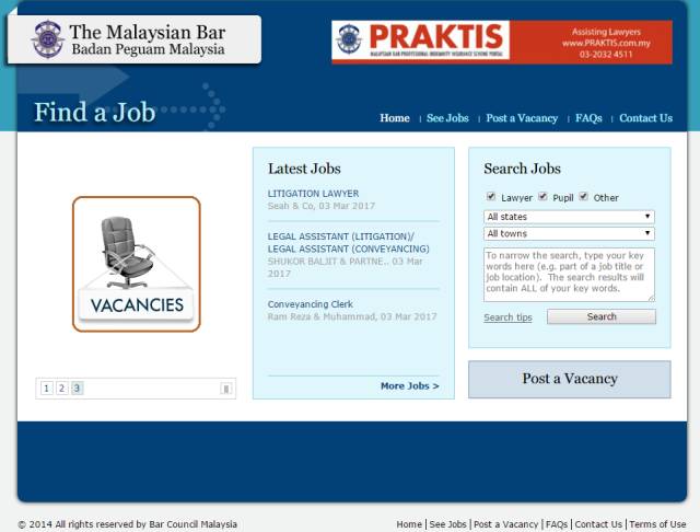 The Malaysian Bar是马来西亚毕业生寻找有关法律招聘信息的网站。除了提供招聘信息外,它还是一个马来西亚法律新闻网。