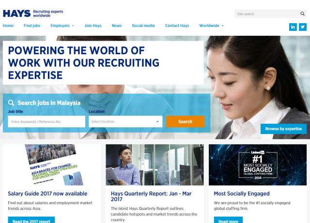 瀚纳仕在马来西亚的官方网站。瀚纳仕(Hays,LON:HAS),是全球领先的专业招聘集团,在各个行业招聘合格、专业且技能精通的精英人士,负责固定职位,合同工作以及临时委派任务的招聘工作。