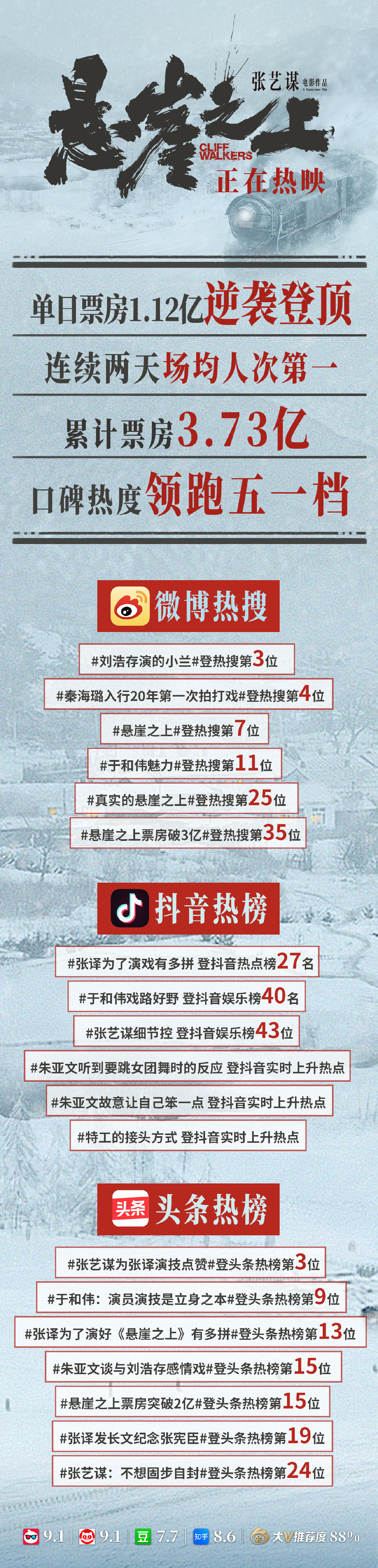 5月3日,在上映后的第四天,张艺谋导演的《悬崖之上》凭借良好的口碑逆袭爱情片《你的婚礼》,以1.12亿的票房成绩夺得单日票房冠军。据灯塔专业版数据:截止5月4日记者截稿时,《悬崖之上》的总票房已经突破3.8亿,业内预测该片最终票房会突破8亿。