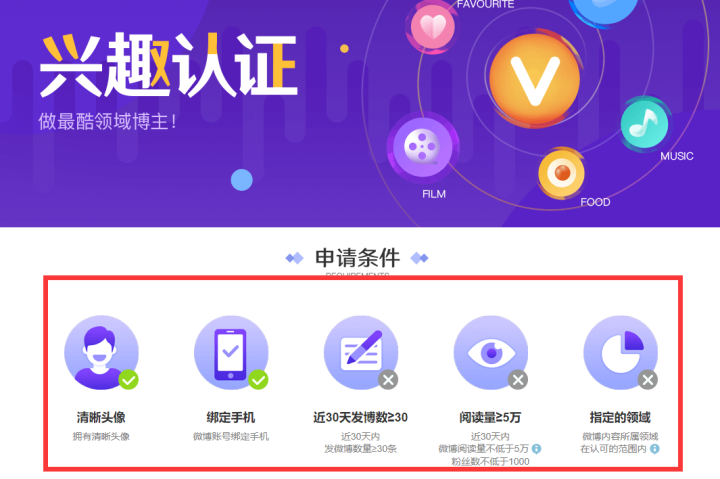 接下来我们再来看一下要申请微博兴趣认证有哪些要求需要满足(看下图),提交申请的前提就是先必须达到申请条件!