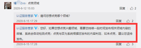 这一项看上去简单,实际上也是要求最高的一项,因为它的评判条件是隐藏的,完全由系统来判断你发的内容是否满足,黄蓝V社也有当天就能获得认证的方法;可以看下面的截图,是微博官方人员的回复:“如果您想点亮兴趣领域,需要您持续一段时间发布相关领域内容的微博,系统会自动检测点亮;点亮与否为系统根据您发布的内容判定,如未点亮,建议您坚持发布。”