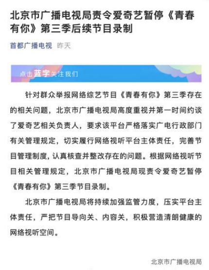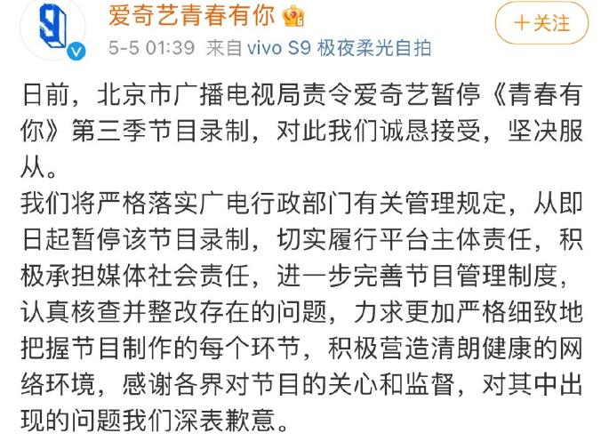 《青春有你》第三季开播之后不断被舆论推上风口浪尖,终于5月4日北京广电总局率先出击,责令《青春有你》第三季停止录制,而随后《青春有你》主办方也对此事作出回应,表示已认识到自身工作当中出现的严重失误,尊重北京广电总局作出的决定,《青春有你》第三季将暂时停止录制。