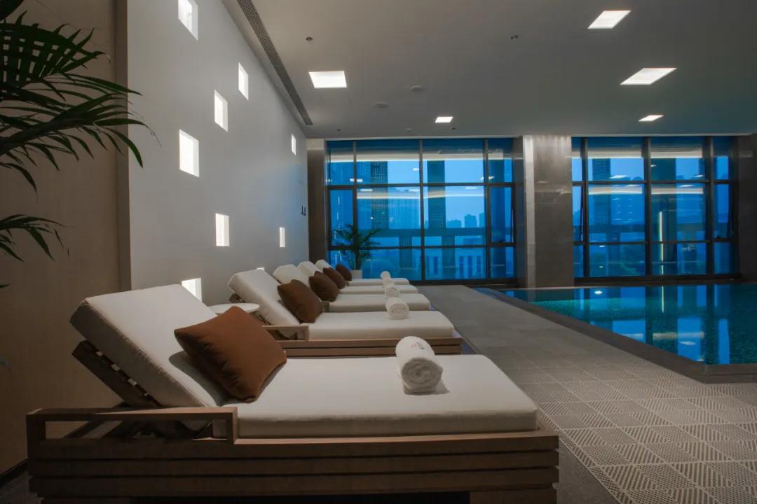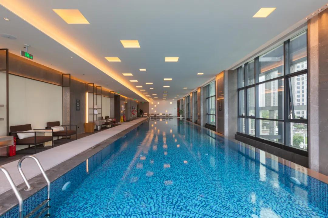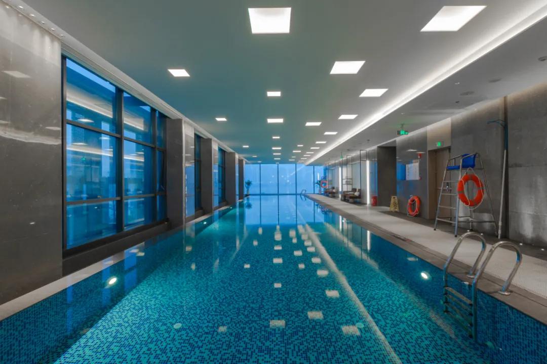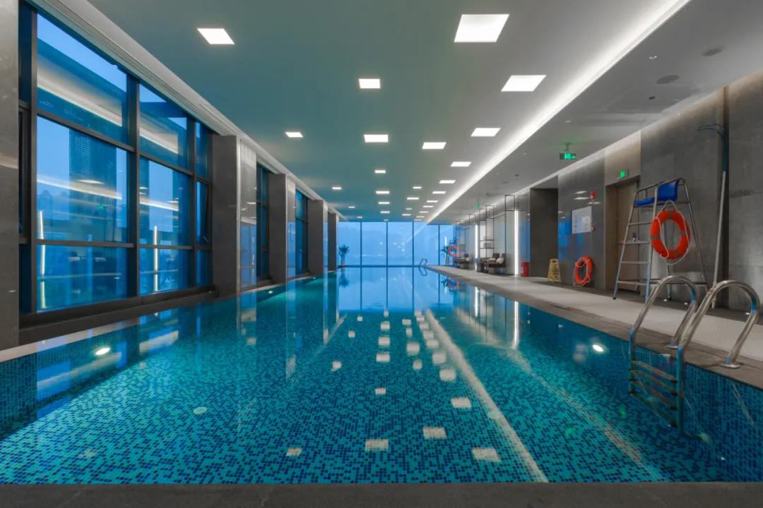 在三楼另一端则是公寓两面全景落地窗的室内恒温泳池,泳池全年恒温在28-30摄氏度之间,落地窗的设计,能更好的把梅溪湖美景收入进来,想必今夏,将会有许多网红小哥哥小姐姐在这里打卡秀身材了。