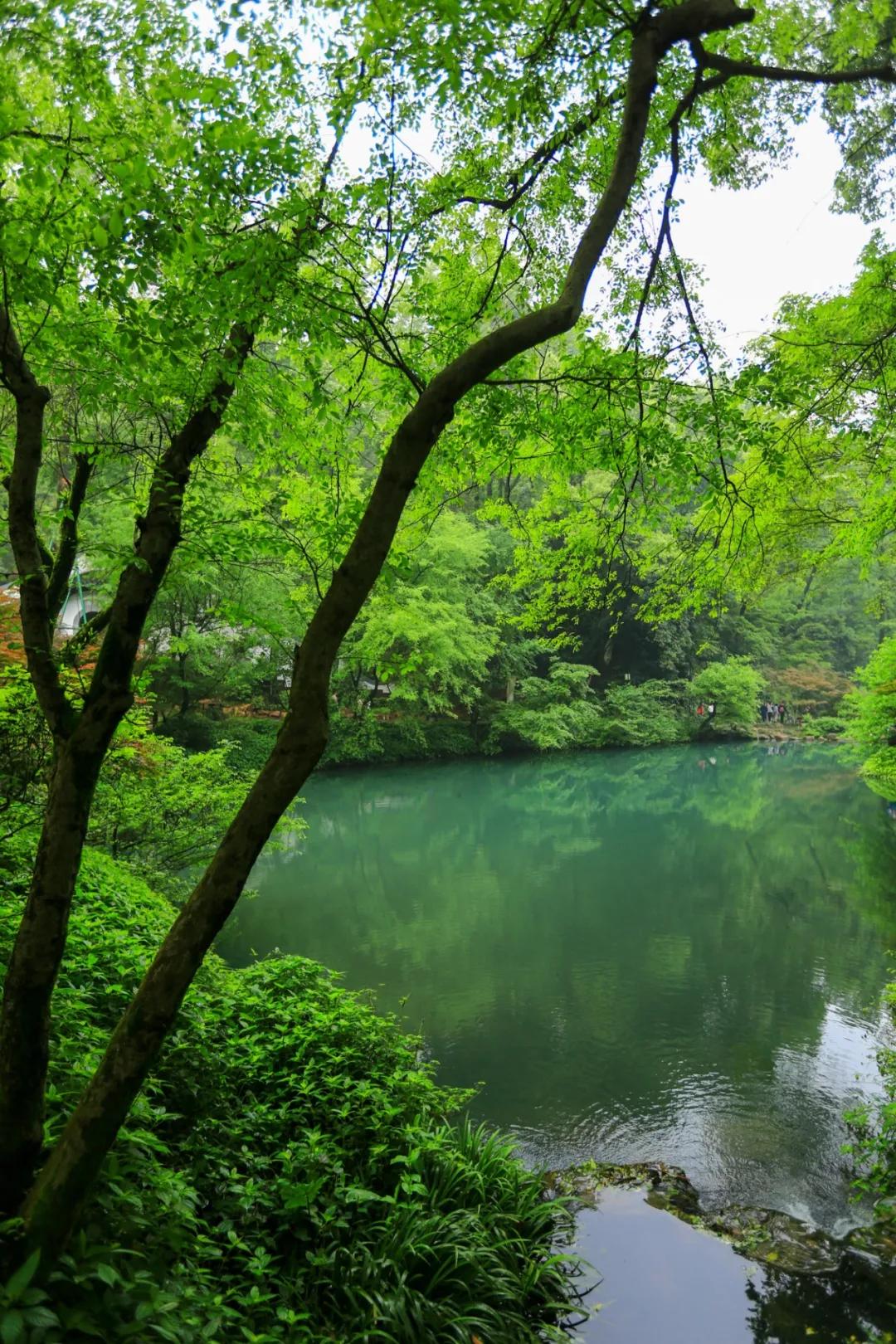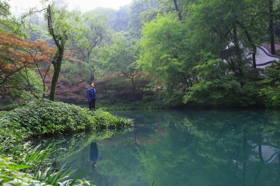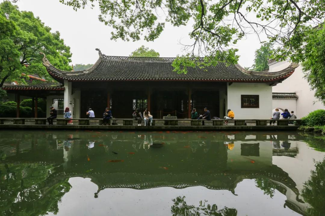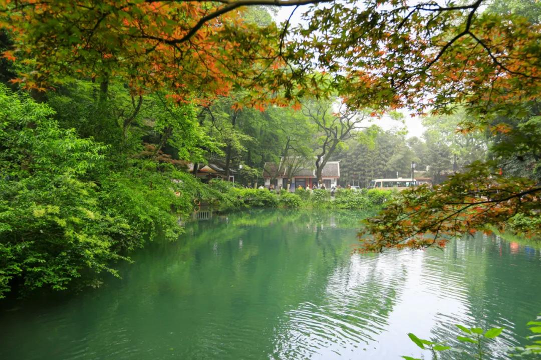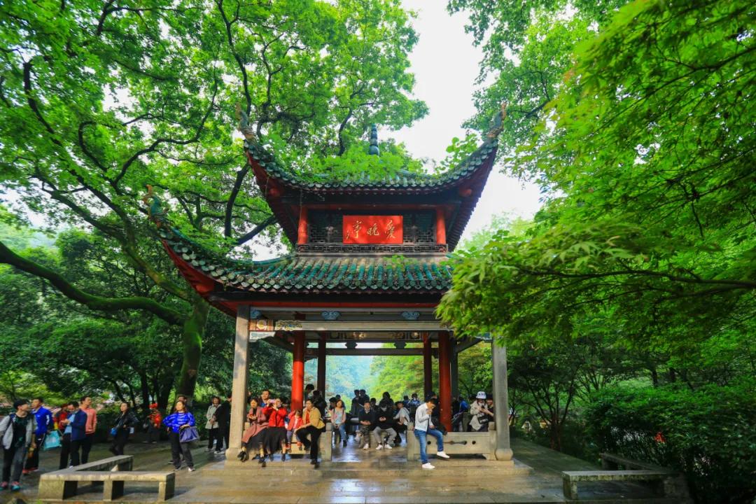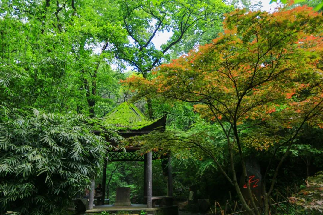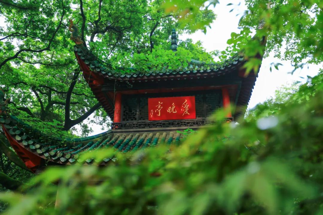 想必杜牧的《山行》许多人都耳熟能详,一句“停车坐爱枫林晚,霜叶红于二月花”流传至今。位于岳麓山下的爱晚亭名字便由此而来,爱晚亭八柱重檐,顶部覆盖绿色琉璃瓦,攒尖宝顶,十分壮观。虽然如今是五月天,没有火红的枫叶,但是在小溪镜湖下,绿树成荫,也别有一番情趣。