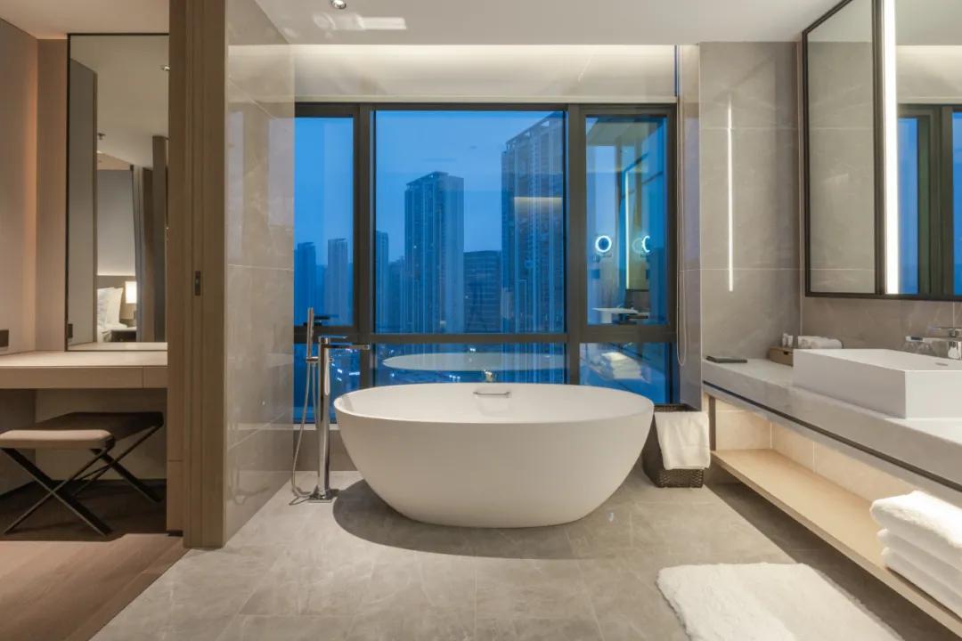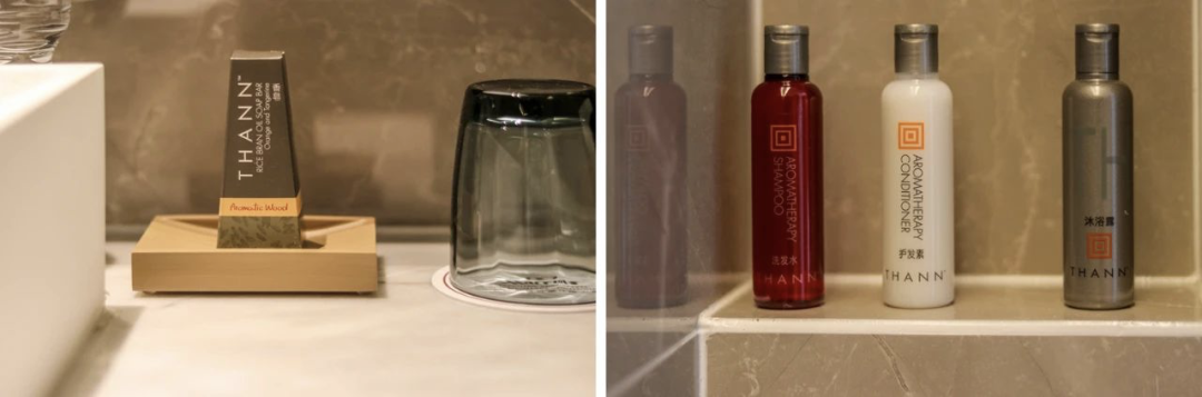 洗漱台旁边的淋浴间,还配备有蛋形的浴缸,旁边摆放有可爱的小黄鸭,想必亲子家庭来入住,小朋友又可以在这里好好玩耍了,而且不担心水淋湿到外面来。沐浴备品选择了万豪酒店同款,源自泰国的纯天然护理产品THANN。