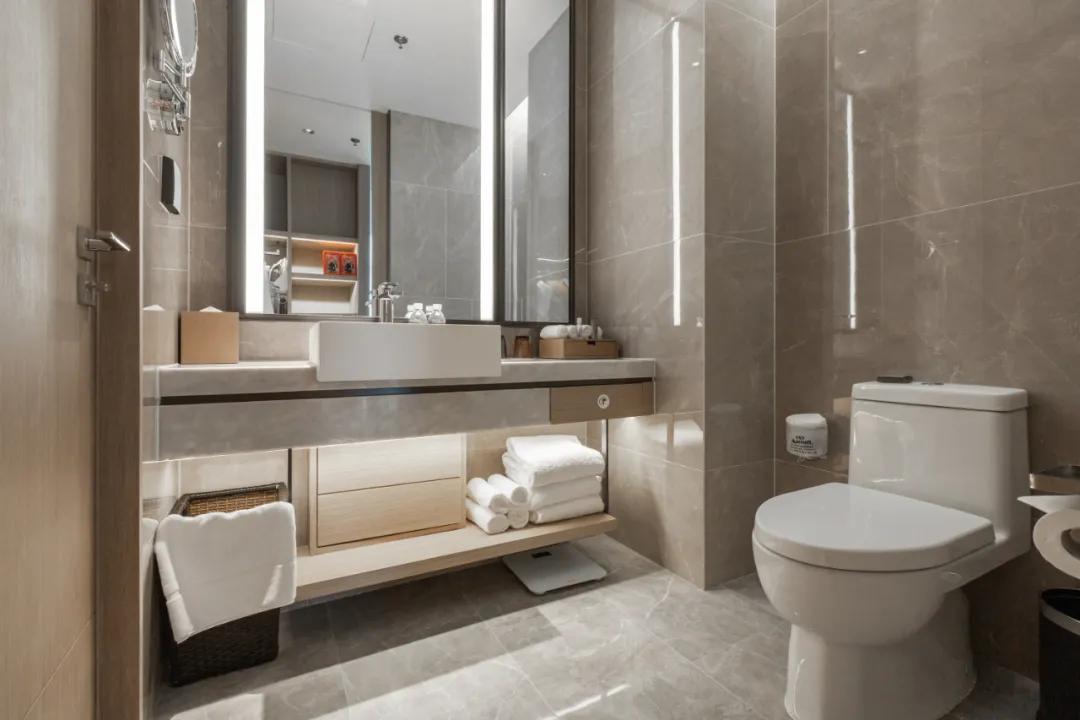 一居室虽然只配备了一个卫生间,但是室内空间格局上都经过巧妙的设计,客厅有一道门可以直接进入卫生间,并不需要通过卧室,而卧室去卫生间也只是穿过衣帽间而已;这样确保了卧室的隐私,又不影响来访客人使用卫生间。卫生间配备了许多毛巾和浴巾,方便入住客人的使用。