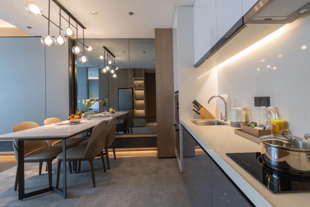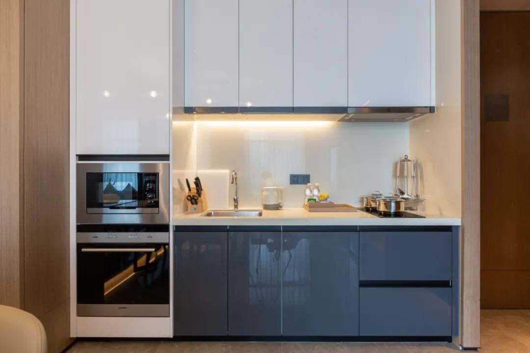 客厅的厨房配备了设施齐全的厨具,而且都是高端品牌,比如全套伊莱克斯的电器、WMF的刀、网红款的cetis电水壶。宾客可以在房间烹制美食,一展厨艺。