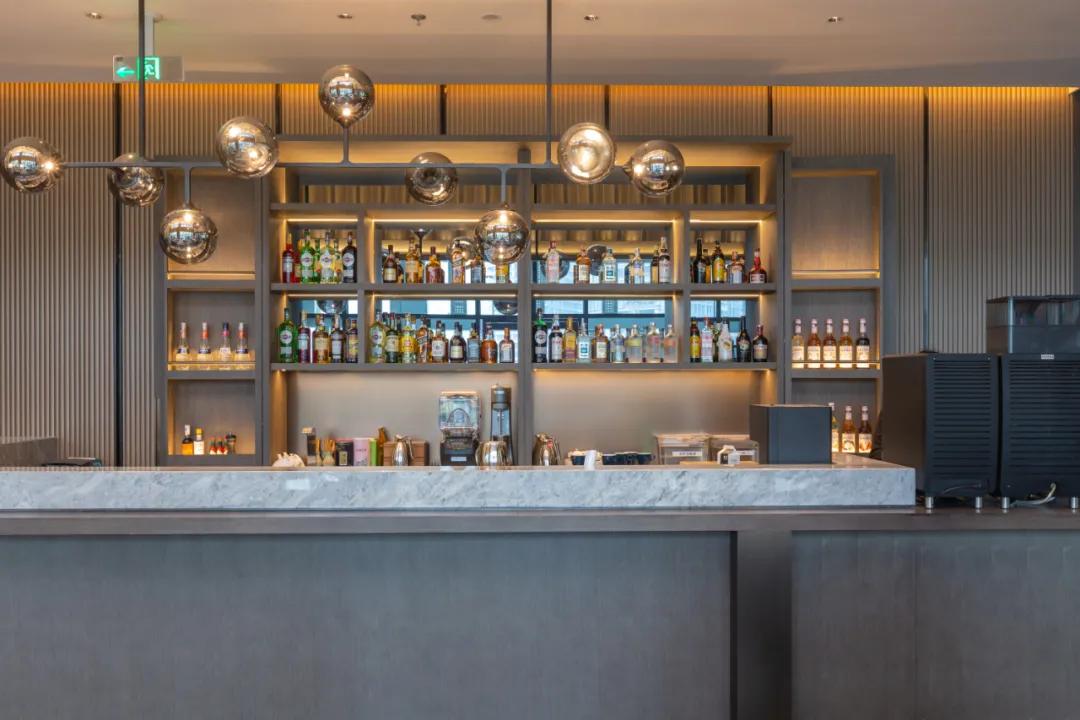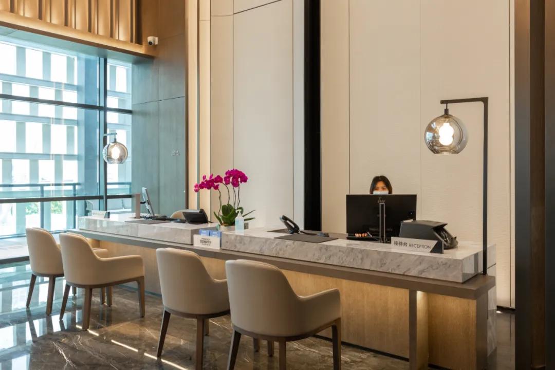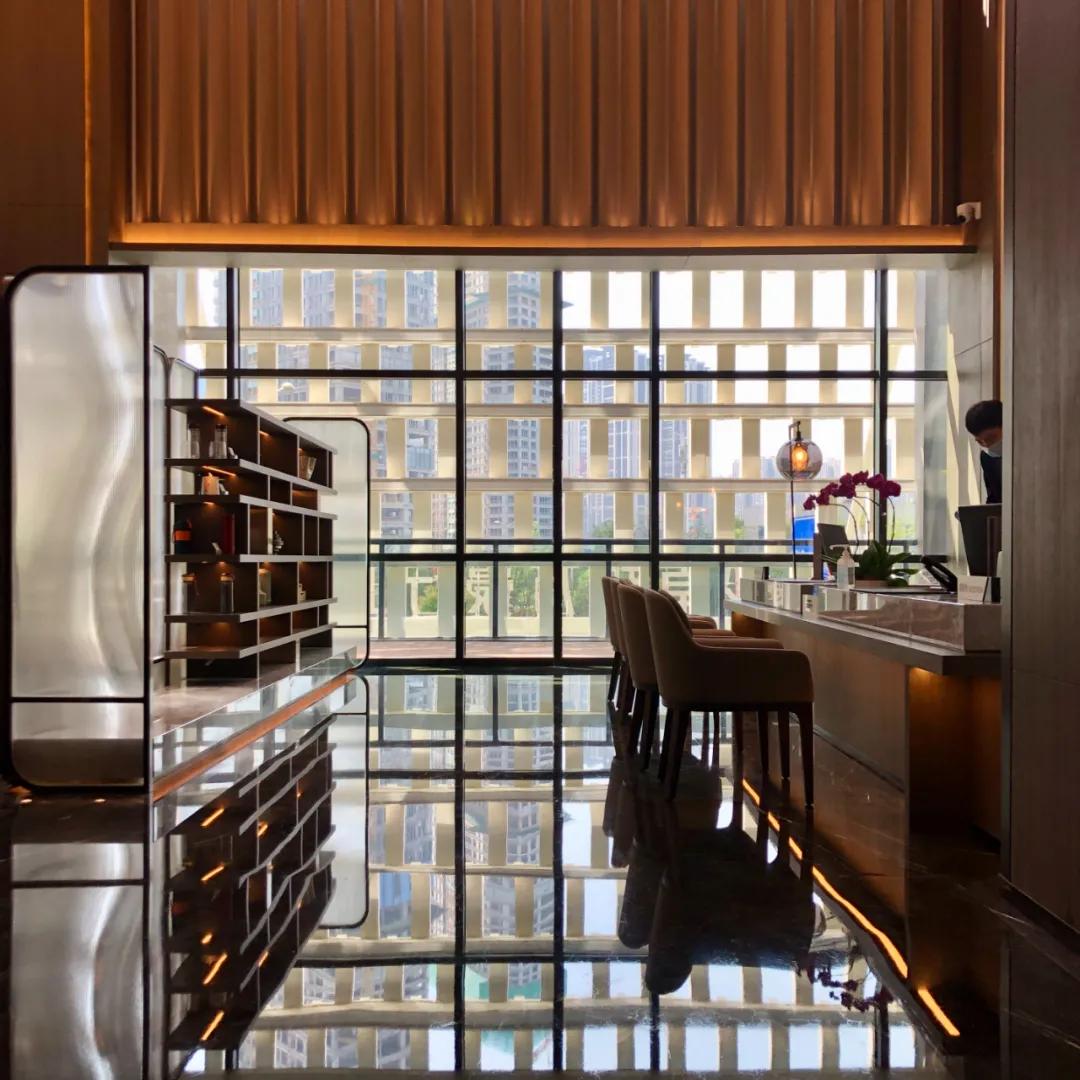 乘坐电梯抵达二楼,从电梯走出来,映入眼帘的是酒店的大堂吧和前台。由于酒店整栋楼体建筑采用落地窗设计,自然采光充足。此刻阳光洒进来大堂吧和前台,将这两个月阴雨天的长沙一扫而光。