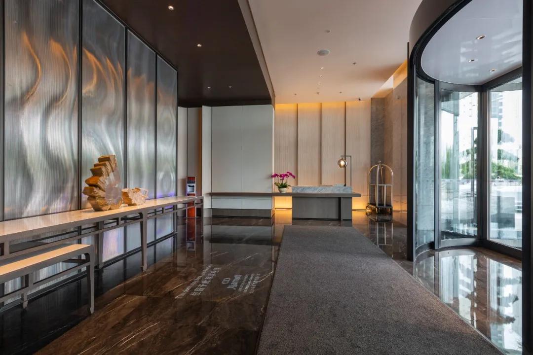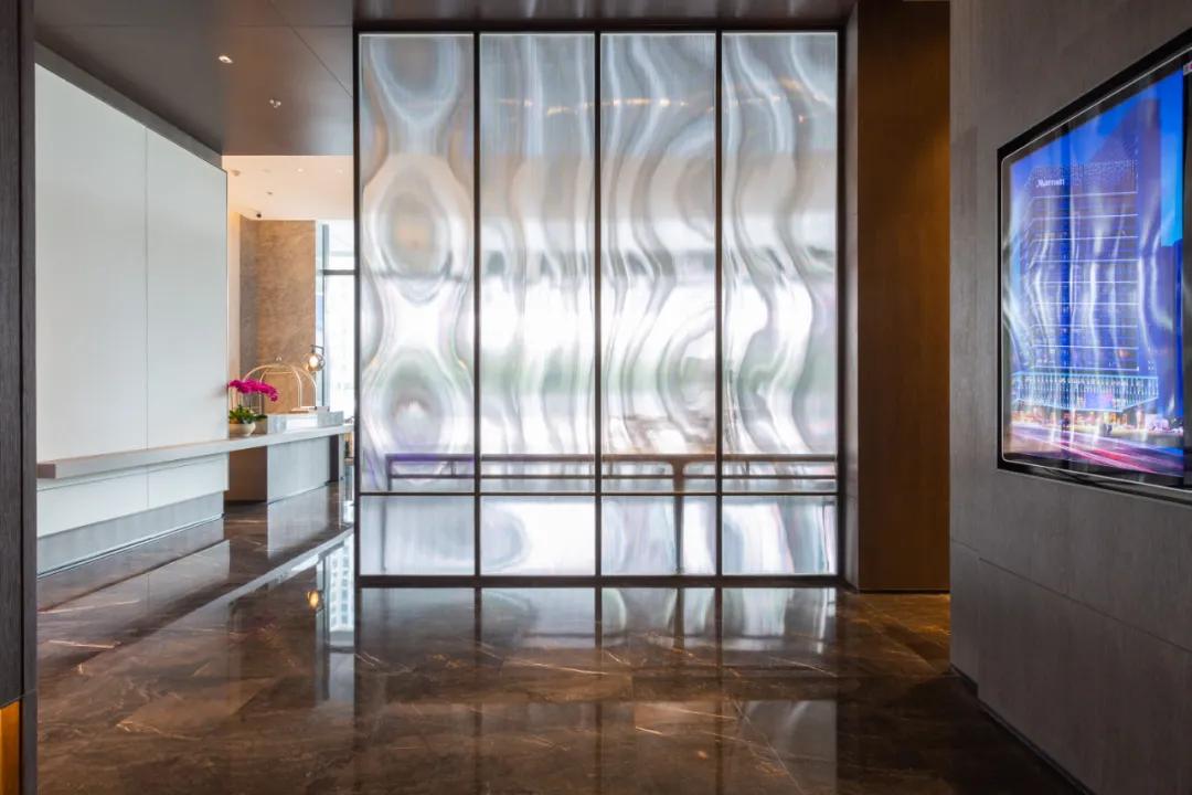 穿过酒店大门,宽大的屏风采用浏阳夏布的造型,将电梯厅与旋转门隔开,正中间摆放有菊花花瓣造型的艺术品,寓意为“人缘石而雅,石缘菊而珍”;右侧是礼宾台。